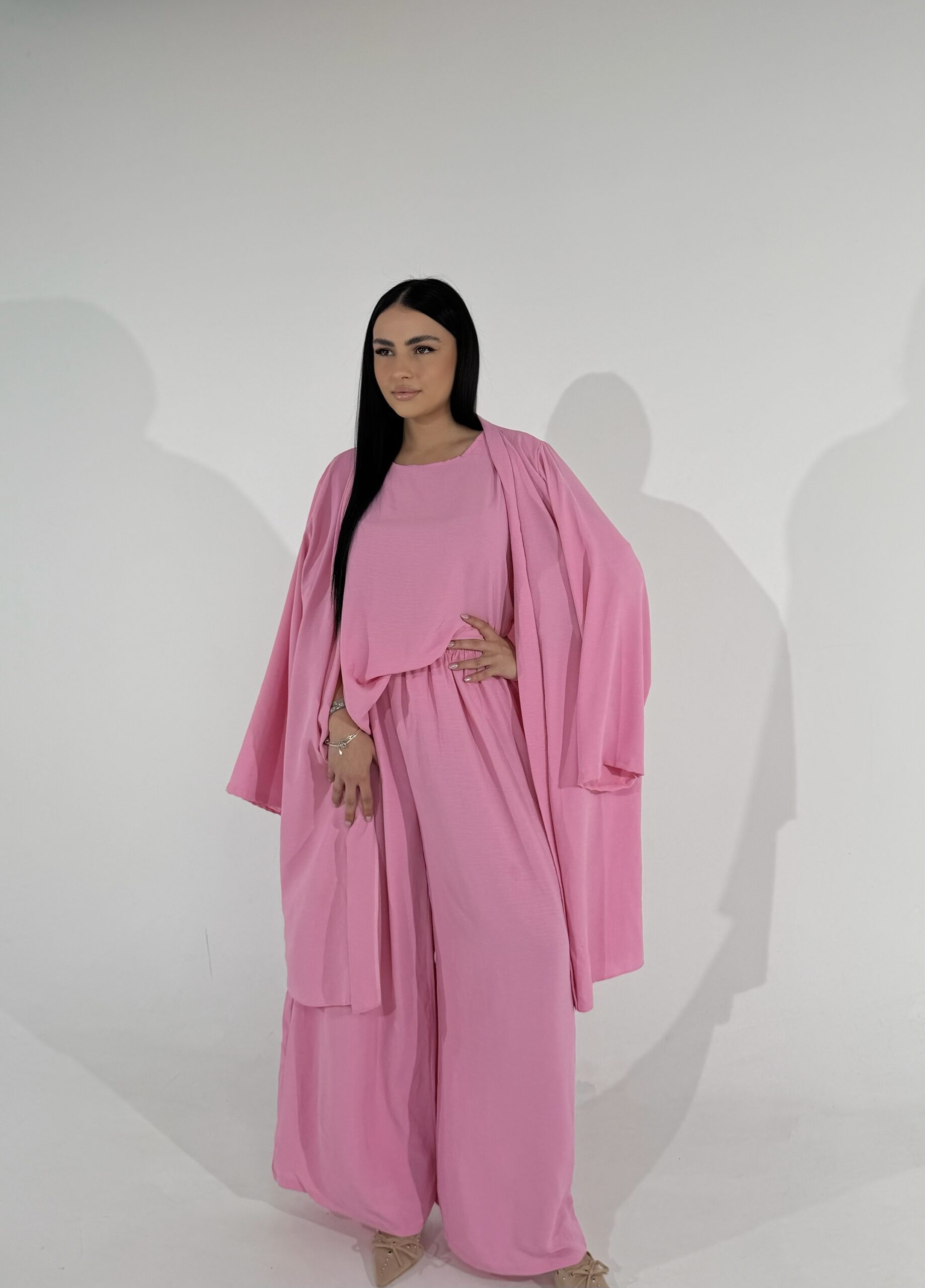 Σούπερ ελαστικό σετ 3 τεμαχίων , αμανικη δροσερή μπλούζα με ψηλομεση σούπερ ελαστική παντελονα & oversized κιμονό .