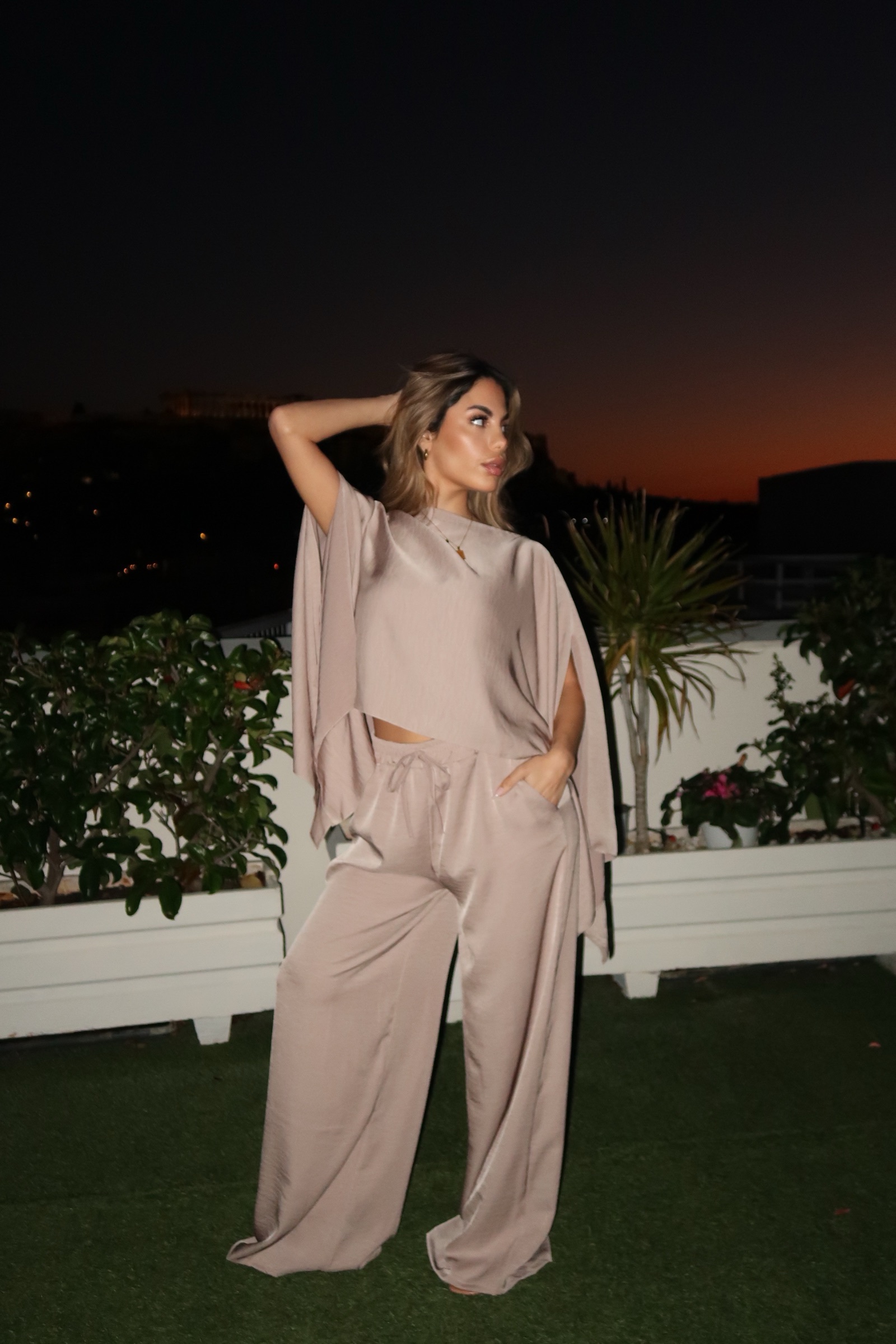 Απίθανο σετ 3 τεμαχίων με στραπλες τοπ , ψηλομεση παντελονα & μπλούζα τύπου κάπα. Καλύπτει έως XL