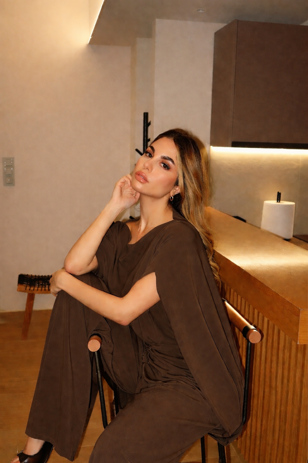 Απίθανο σετ 3 τεμαχίων με στραπλες τοπ , ψηλομεση παντελονα & μπλούζα τύπου κάπα. Καλύπτει έως XL