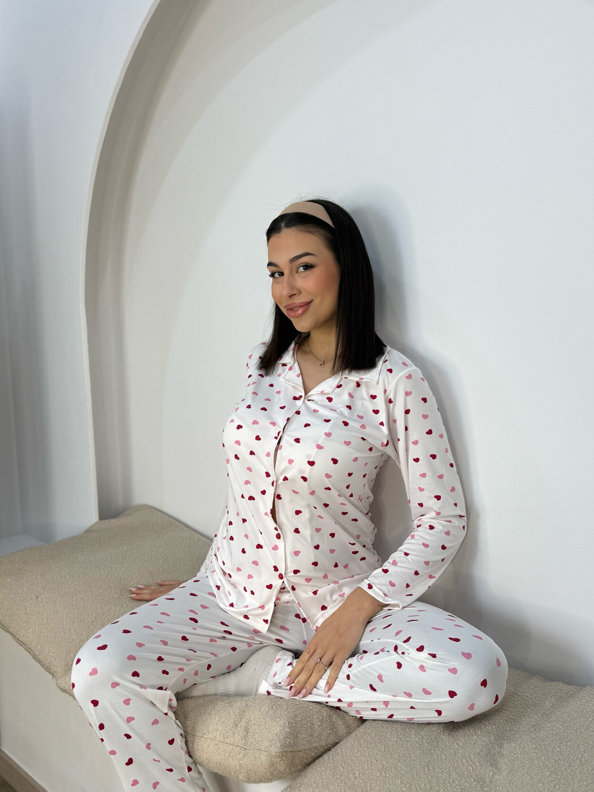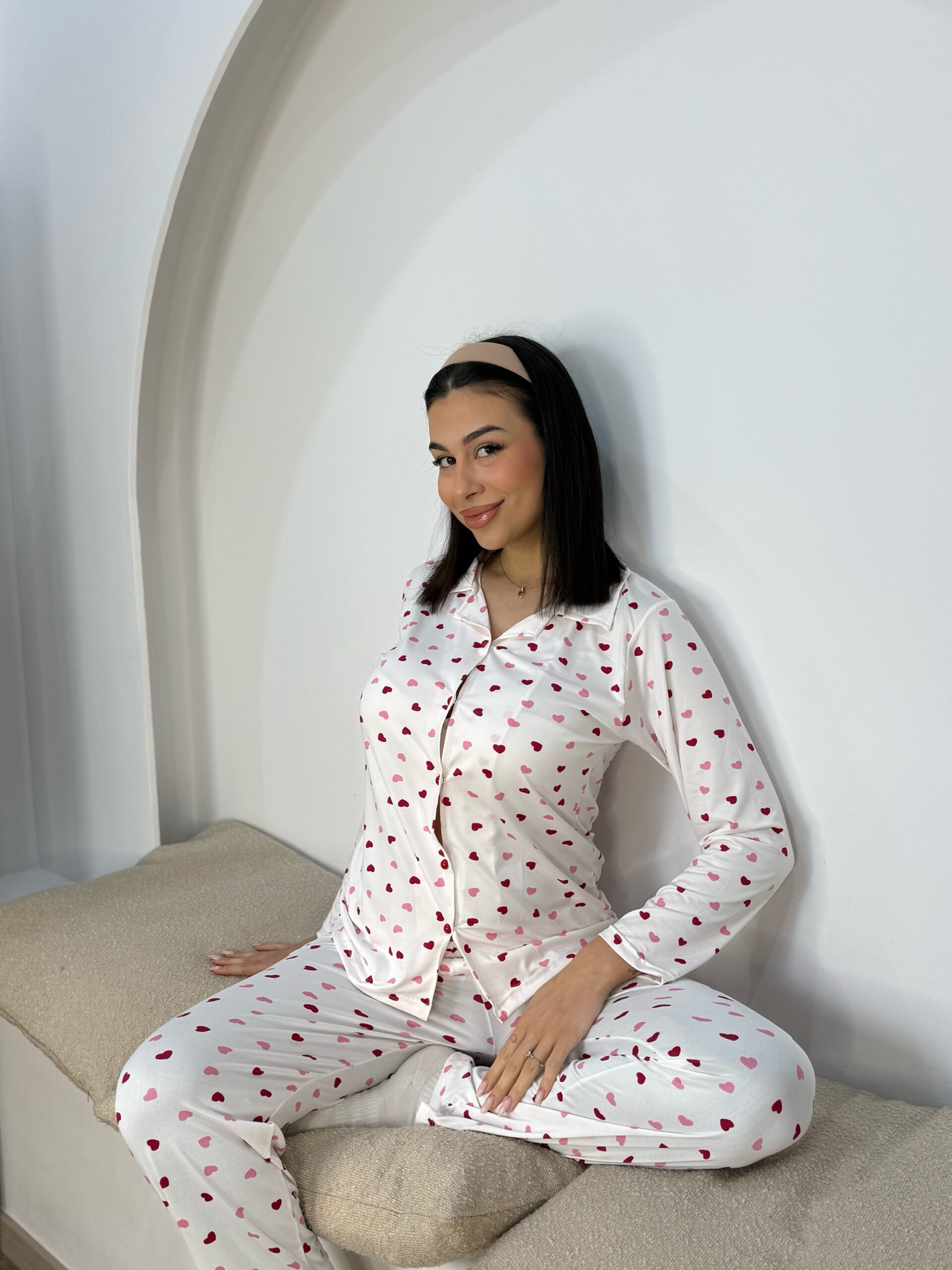 Πυτζαμα με κουμπάκια Λευκό με κόκκινες & ροζ καρδούλες