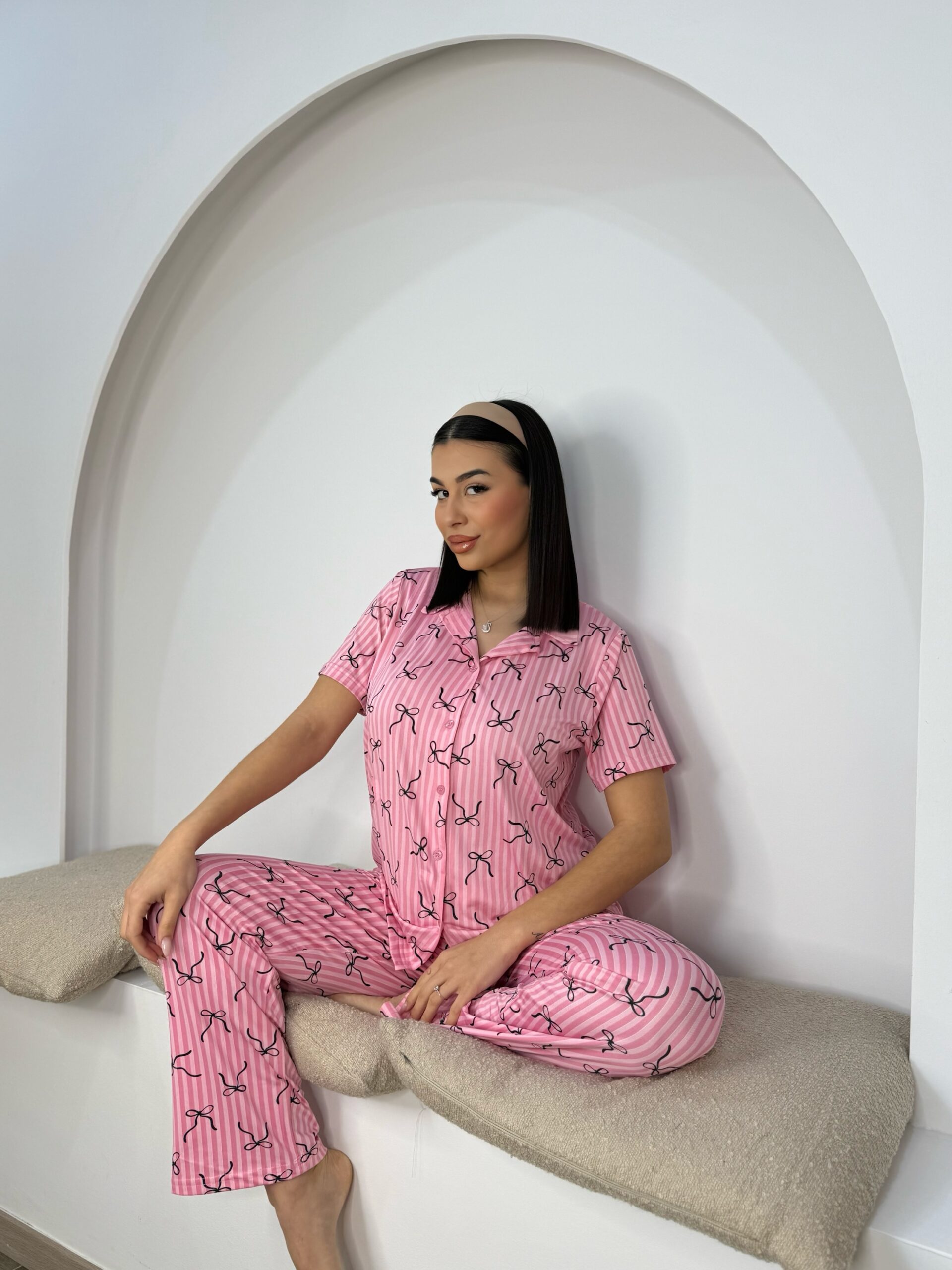 Κοντομάνικη Πυτζαμα Ροζ Φιογκάκια με Ρίγες