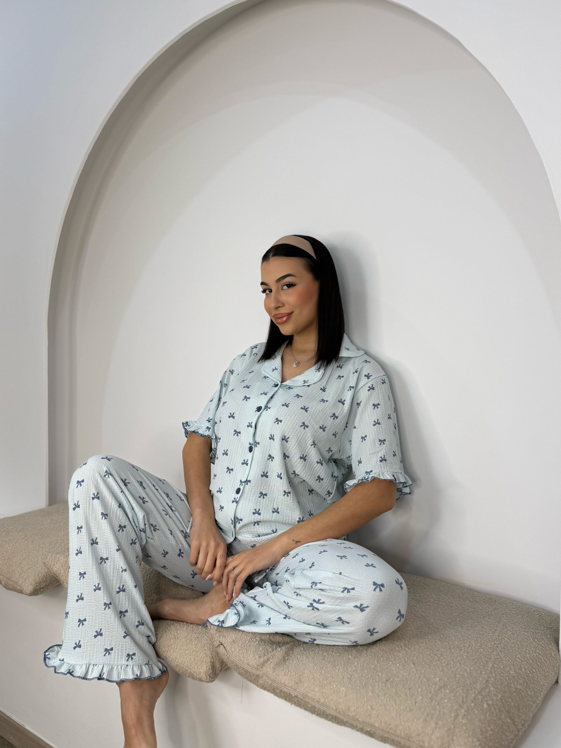 Κοντομάνικη Πυτζαμα Γαλάζιο Γκοφρέ με Φιογκακια
