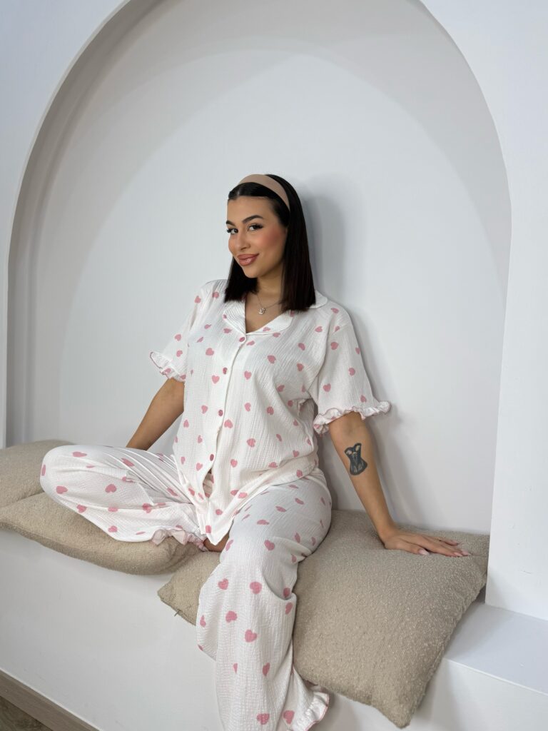 Κοντομάνικη Πυτζαμα Λευκή Γκοφρέ με Καρδούλες